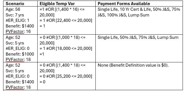 As an example, assume a participant is eligible to take a benefit if they either reach early retirement eligibility at commencement of age 55 with 5 years of vesting or if the present value of the benefit is under $20,000. The benefit is available as a Lump Sum or Single Life, 10 Year Certain and Life, or 50%, 75%, or 100% Joint & Survivor annuity, where the 10 Year Certain and Life and 100% Joint and Survivor optional forms are only available after reaching early retirement eligibility.