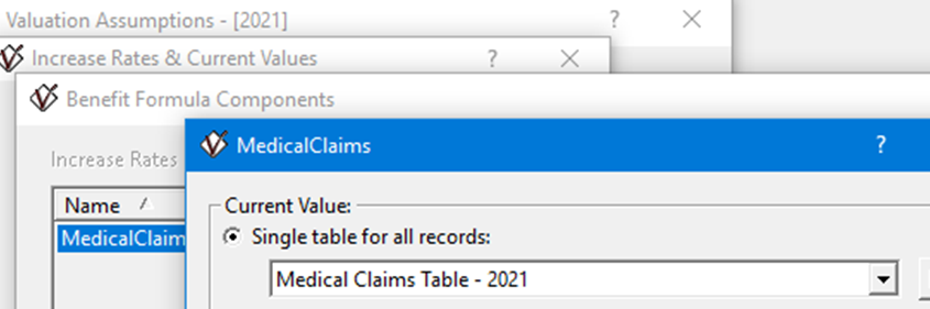 When the underlying claim amounts or increase rates change, create new Valuation Assumptions which reference the new tables (no change is needed to your Benefit Definitions or Plan Definition).