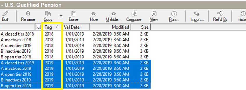 Tags can be used to organize groups in any library. Examples include valuations (such as baseline results versus assumption change results) and benefit definitions (such as medical versus life insurance or union versus non-union).