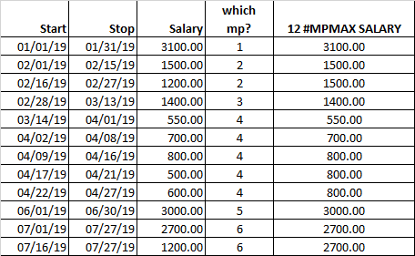 Start/stop arrays are first sorted by start date (ascending) and then by stop date (ascending). Next the stop date associated with each reported salary is used to determine to which month each salary belongs (see which mp? column). Finally, the values are successively maximized within each month (as indicated by the specified measurement period, 12).