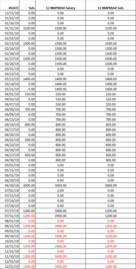 Like the first sample expression above (12 #MPMAX Salary), EOM_dt #MPMAX AdjSals successively maximizes the values on a monthly basis: the first value in each month is unchanged; the second value of each month is the maximum of the first 2 values in the month; the 3rd value in each month is the maximum of the first 3 values in the month; etc. However, in this case the "measurement periods" are defined by the dates in EOM_dt which contains the stop date of each reported salary rounded to the end of the month. The thing to note here is that all values with the same date are considered to be in the same measurement period. It does not matter whether those dates are end of month dates, beginning of the month dates, or the 17th of the month dates. The only thing that matters is that all the dates for a particular measurement period are the same and that the dates in EOM_DT are non-decreasing.