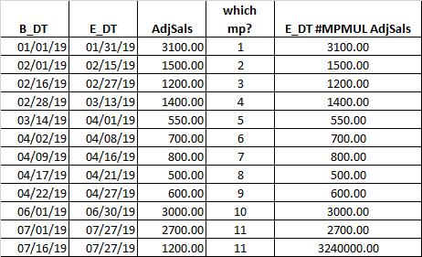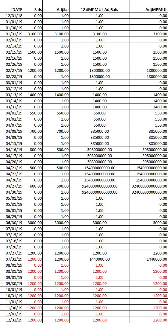 Like the first sample expression above (12 #MPMUL Salary), EOM_dt #MPMUL AdjSals multiplies the values on a monthly basis: the first value in each month is unchanged; the second value of each month is the product of the first 2 values in the month; the 3rd value in each month is the product of the first 3 values in the month; etc.. However, in this case the "measurement periods" are defined by the dates in EOM_dt which contains the stop date of each reported salary rounded to the end of the month. The thing to note here is that all values with the same date are successively multiplied. It does not matter whether those dates are end of month dates, beginning of the month dates, or the 17th of the month dates. The only thing that matters is that all the dates for a particular measurement period are the same and that the dates in EOM_DT are non-decreasing.