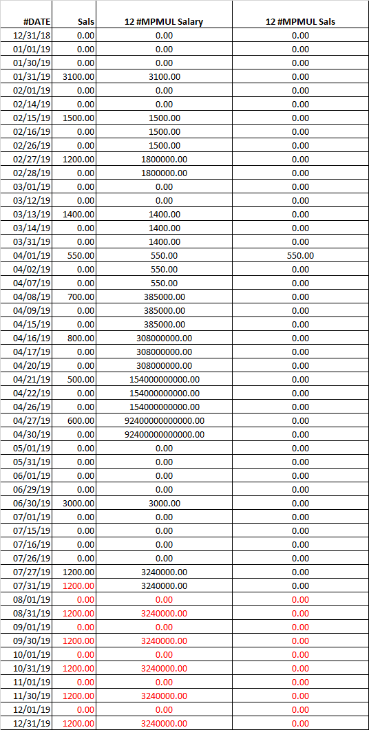 Because the Salary start/stop array field was converted into an array with a calculation date set of number of values using zeros, those zeros had a big impact on the final #MPMUL results. If this is not what you want, then you can replace the zeros with ones, perform the #MPMUL, and then turn the "ones" back into zeros: