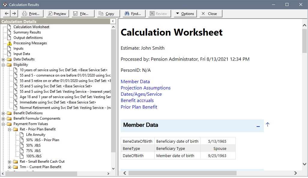 Calculation Worksheet provides a participant and analyst friendly development of the benefit calculation along with supporting data for review purposes. The menu section at the top has hyperlinks so if you know what you want to look at, you can jump to that section, and from each section you can jump back to the top. The Member Data section, by default, displays the data fields referenced in the calculation that have been parameterized in the Data Dictionary to "Display first when reviewing data". You can use the Options button on the top row to pick additional fields for inclusion. The Benefit Definition payment form details can be displayed on either a monthly or annual basis, again controlled by the Options button.