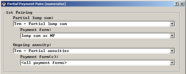 the "Cash balance" Benefit Definition. Leave the Cash balance as "<same> ." Click OK. Thus, the Cash balance Benefit Definition represents the total value of the benefit, so it is the denominator for relative value calculations. - Check Reflect partial payments (numerator) and click the Partial payment pairs button. We will need only one partial lump sum pairing. The "Partial lump sum" Benefit Definition (with its single lump sum payment form) will be added to all of the payment forms of the "Partial annuity" Benefit Definition to make the numerator of the relative value calculation. Thus, if a member selects a partial lump sum with a partial annuity, the values of these two payment forms will be added together and compared to the value of the full cash balance to determine the relative value.
