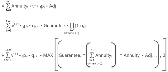 The present value can be represented formulaically as the present value of the single life annuity plus the present value of the guaranteed amount (as a decreasing life insurance). The formula below breaks the present value of the guaranteed amount into the part attributable to any deferral period and the part attributable to commencement of the annuity.