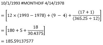 10/1/1993 #MONTHDIF 4/14/1978 equals 185.5666667