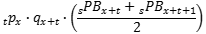 where   is the projected benefit payment paid at age s after decrementing at the beginning of the year of age x; all other terms are as defined above for the middle of year present value. In the year of decrement (when s=x+t), the term   is defined to be 0, resulting in a half-year payment. The averaging also results in a half-year mortality discount (if applicable) for the year of decrement that carries through to all subsequent payment ages. Note that the first year's projected benefit will generally differ slightly from the expected benefit payment because of their different methods of reflecting a half-year payment and mortality discount. For lump sums, treating each payment age separately could split the lump sum into two payments, so the portion of the average lump sum derived from decrement age x+t+1 is shifted to align with the lump sum from decrement age x+t; this only affects the timing of the payment, not the expected value of the payment.