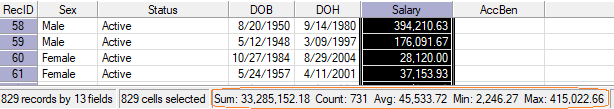 Click Home > Frequency Tables to get headcounts for the current database grouped by one or more fields (e.g., by status, by age, by age and service). Checking headcounts for reasonableness is a common step after importing data. For more information, see Frequency Tables.