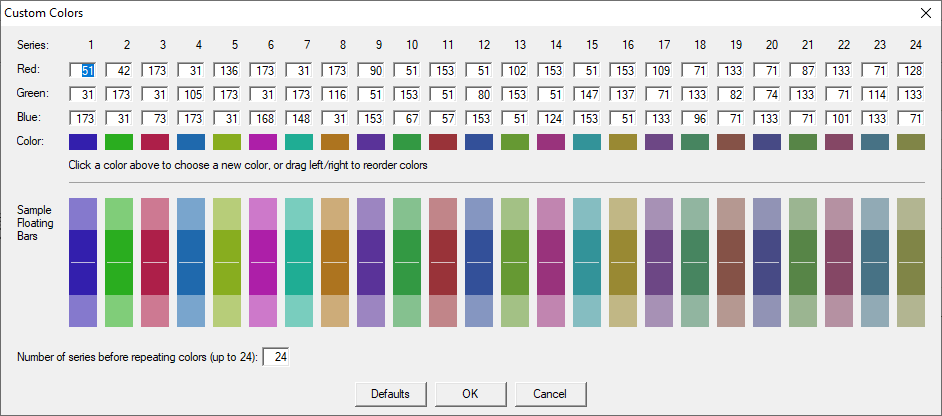The defaults have been chosen to a) provide optimal contrast when projecting onto a large screen, b) ensure adjacent Series are well differentiated and c) avoid repeating colors for up to 24 Series. The defaults can be restored using the Defaults button.