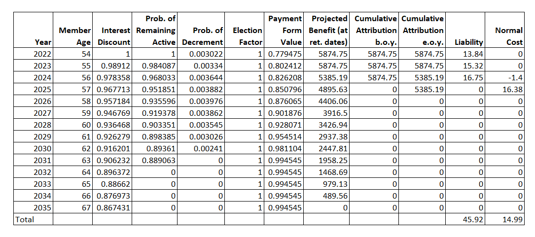 The cumulative attribution at beginning of year will be zeroed out for decrement ages in the forth year after the valuation date and beyond. The cumulative attribution at end of year benefit will be zeroed out for decrement ages in the fifth year after the valuation date and beyond.