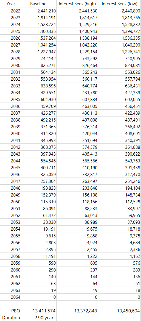 The high interest sensitivity calculates the underlying benefit payment stream using an annuity conversion rate of 6.35% (6.25% + 0.10%) and then discounts those benefit payments using a valuation interest rate of 6.35%. Similarly, the low interest sensitivity calculates the underlying benefit payment stream using an annuity conversion rate of 6.15% (6.25% - 0.10%) and then discounts those benefit payments using a valuation interest rate of 6.15%. The PBO projected benefit payments and effective duration calculation for this plan are in the table below. In this example, the duration would be much larger if the conversion interest assumption was excluded from the Interest Sensitivity Set.